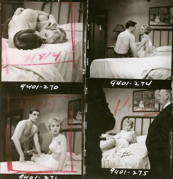 Практически в каждой афише для фильма Хичкок создает полуобнаженный образ Мэрион в белье. Тем самым, он использует допустимую полунаготу как маркетинговый ресурс: обещание сексуальной откровенности становится крючком для массовой аудитории. Одновременно акцент на героине в белье формирует у зрителя ожидание, что именно она — центр повествования, что усиливает эффект шока от ее ранней смерти и подчеркивает разрыв фильма с прежней моральной и визуальной нормой голливудского кино.