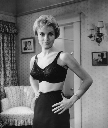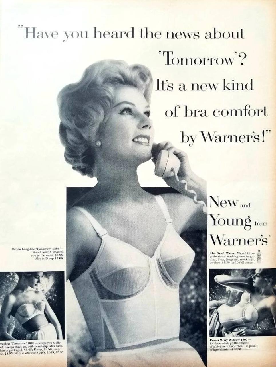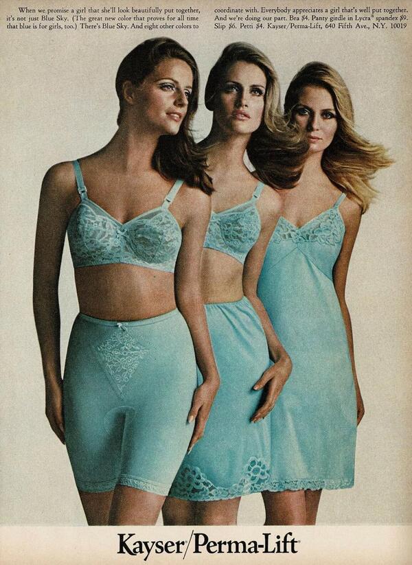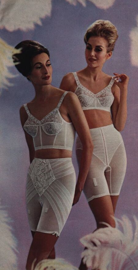 В 1960-е годы женское белье одновременно сохраняет черты корсетной традиции и становится одним из ключевых знаков новой сексуальности, сначала воспринимаясь как культурный вызов, а затем постепенно превращаясь в норму повседневного и экранного образа. В начале десятилетия доминируют жестко скроенные бюстгальтеры с четкой формой чашки, высокие трусы и утягивающие грации, к которым почти обязательно добавляются чулки и пояс для чулок — не только как функциональный элемент, но как зримо подчеркнутая часть женского силуэта. Во второй половине 1960-х силуэт смягчается: появляются более легкие, «естественные» лифы, трусики опускаются ниже талии, активно используются синтетические ткани (нейлон, лайкра), а тонкие комбинации, ночные сорочки и пеньюары в пастельных тонах делают видимым сам пласт домашней, полупубличной сексуальности. В визуальной культуре — кино, рекламе, журнальных съемках — к мотиву раздевания и частичной наготы обращаются все чаще: белье и детали вроде чулок с поясом выносятся на передний план как эстетизированные и эротизированные маркеры женственности, которые уже не скрываются, а демонстративно показываются как часть «современного» женского образа.