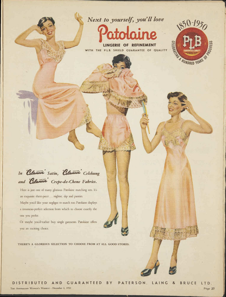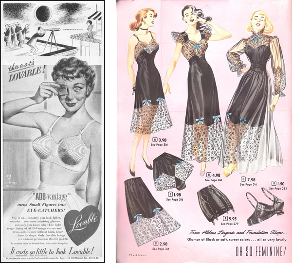 Женское белье 1950-х годов формировалось на пересечении технологических новаций и идеологии послевоенной конвенциональной женственности. Центральным стало конструирование фигуры «песочные часы»: узкая талия, приподнятая грудь, округлые бедра. Этого добивались с помощью корсетных изделий нового типа: «girdles», «longline bras», комбинаций. Бюстгальтер, особенно «bullet bra» с конусообразной формой чашек, становится ключевым инструментом моделирования тела и визуально поддерживает эстетику «New Look». Нижняя часть комплекта (girdles, panty-girdles, slips) сглаживала контуры под одеждой и фиксировала чулки, одновременно транслируя идеал «собранной», дисциплинированной женственности. Ночная одежда — ночные рубашки, пеньюары, комбинации из легких синтетических материалов — интегрируется в культуру «домашней элегантности»: реклама соединяет сексуализированную телесность с образом респектабельной домохозяйки.