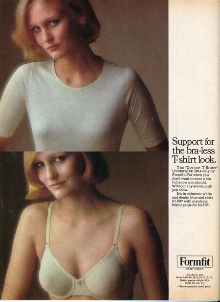 Белье 1970-х годов занимает промежуточное положение между жестко сконструированными силуэтами середины века и «второй кожей» эластичного белья 1980-х. Для десятилетия характерен переход к более естественной линии тела: корсеты и утягивающие пояса окончательно уходят, а бюстгальтеры становятся мягче, с меньшим количеством косточек, часто с формованной чашкой без швов или вообще без выраженной формы. Феминистское движение конца 1960-х — начала 1970-х подталкивают часть женщин к отказу от бюстгальтера.