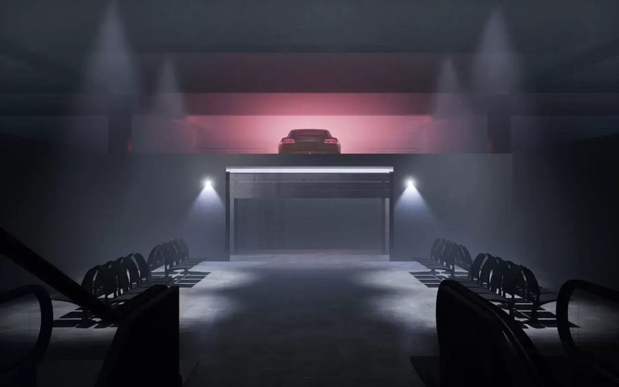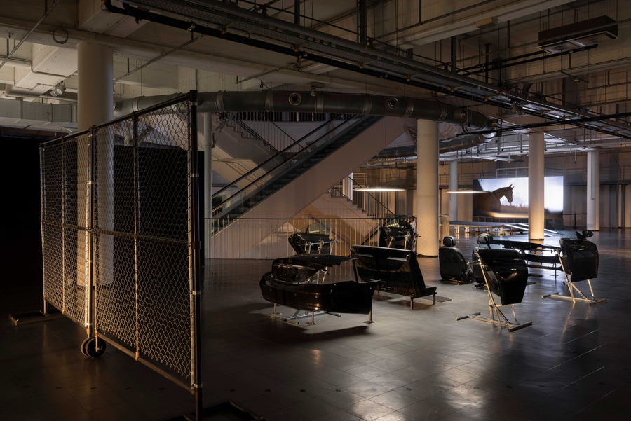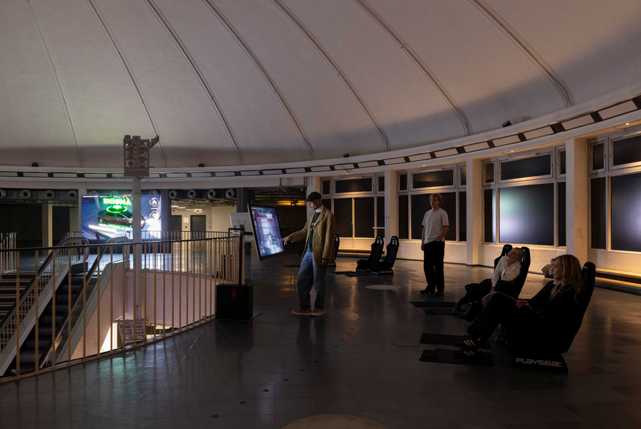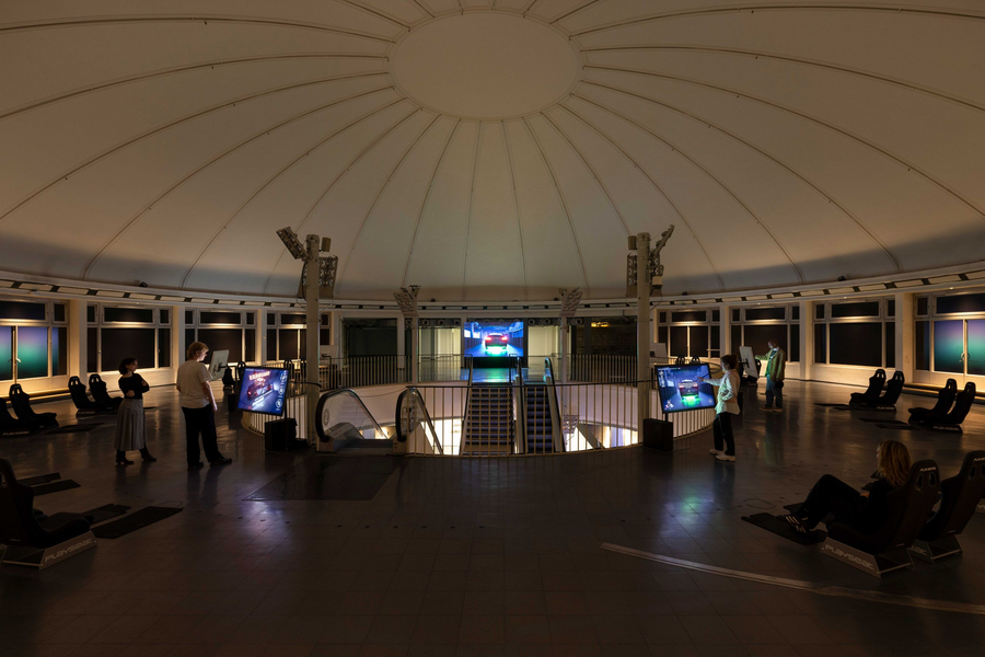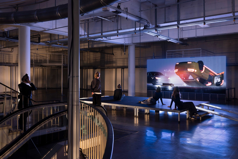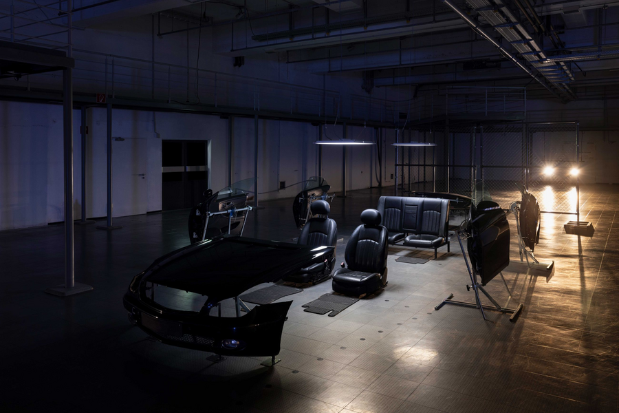 Инсталляция «NOX (нечеловеческое превосходство)» Лоуренса Лека 2023 года представляет собой комплексный мультимедийный проект, где музейный зал превращён в пространственную сцену «реабилитационного центра» для автомобилей, внутри которого вымышленная программа NOX и корпорации Farsight из внутреннего мифа художника курирует терапию машин, «оживленных» процедурной системой. Проект разворачивается по нескольким уровням здания, сочетая локализованную сценографию, кинематографические CGI-проекции, размещённые автомобили и их фрагменты как скульптурные объекты, звуковые полотна и интерактивные элементы — всё это оформлено как единый нарративный ландшафт, где музей функционирует как тотальная инсталляция, объединяющая реальность и вторгнувшуюся в неё виртуальность. Автомобили как часть видеоигры и выставочные объекты в реальном пространстве сращиваются, формируя диегезис выставки.