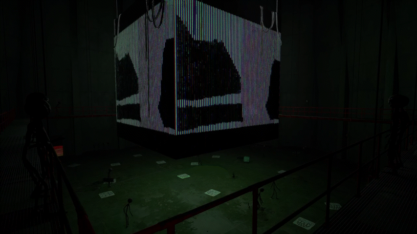 Наиболее репрезентативным местом, где игровые метрики влияют на опыт восприятия аудиотрека является выставочное пространство произведения «Idioteque» Radiohead, которое существует внутри экспозиции таким образом, что игрок может его послушать только в пережатом формате рядом с центром инсталляции, где из небольшого экрана доносятся приглушенные звуки аудио. Здесь игровая система Unreal Engine 5 вмешивается непосредственно в композицию и задаёт другое правило прослушивания, создавая акторную сеть человек-машина.