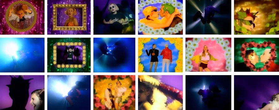 В музыкальных клипах 90-х годов активно использовалась графика, которая стала важной частью визуального языка эпохи. Яркие цветовые сочетания, вспышки и засветы создавали динамику. Значение имела также цветокоррекция, добавлявшая причудливый оттенок коже. Графика, добавленная поверх изображения или являвшаяся отдельным кадром в клипе, представляла собой абстрактные линии, неоновые лучи и схемы, странные фигуры и вымышленные анимации.