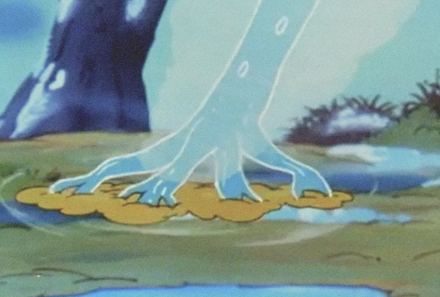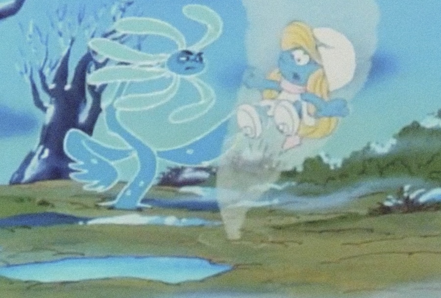 Петалума спасает Смурфетту ценой своей жизни, её уносит ураган, кадры из сериала Смурфики