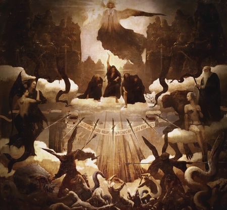 Устремленность крестов в черное небо — символ пустоты, отсутствия высшего смысла или ответа, — усиливает экзистенциальный ужас происходящего: страдание бесконечно, ритуал абсурден, а надежда на искупление или трансценденцию низвергается в бездну.