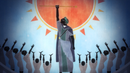 1-2. Кадры из аниме-адаптации «Final Fantasy XV: Episode Ardyn — Prologue» [2019]. Анимационная студия: Satelight. Противопоставление торжествующего Сомнуса и заточенного в Ангелгарде Ардина