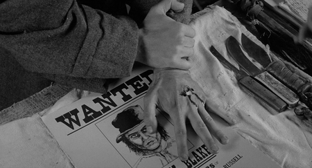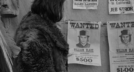 1-2. Кадры из фильма «Мертвец» [1995]. Режиссер: Джим Джармуш. Сравнение объявления о розыске Уильяма Блейка и портрета Никто, обрамленного в подобную рамку