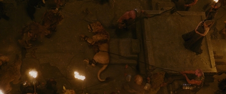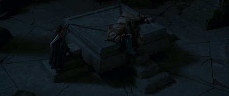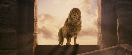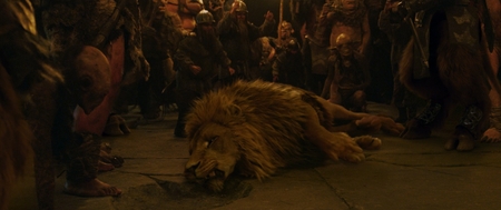 Сознательный отказ от своих царских, даже божественных регалий раскрывается через крупные планы. В сцене, где Аслан уже связан на Столе и Колдунья произносит свои речи, камера часто фокусируется на его глазах. Отсутствие паники, страха или борьбы в глазах Аслана подтверждают мысль: тело связано, но воля и дух свободны. Таким образом, через внешнюю пассивность и степенность, однако, иллюстрируется большая внутренняя сила героя.