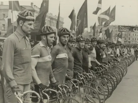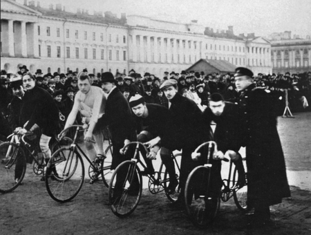 Слева — Велосипедисты на старте на Марсовом поле / 1908–1920 гг., справа — Участники ежегодной велогонки по Садовому кольцу / 1947 г.