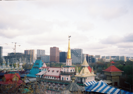 Я поднялась на смотровую башню и увидела интересный контраст: на фоне деревянного, как будто игрушечного, Измайловского Кремля виднелись новостройки, а если посмотреть с другой стороны, то замечаешь огромную барахолку. Как будто в этом месте встречаются три абсолютно разные эпохи.