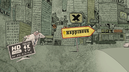 Каждый член крысиного общества стремится к счастью, которое, как все убеждены, можно купить. «Счастье» стало всемирным брендом с отсылками на реальные бездушные корпорации.