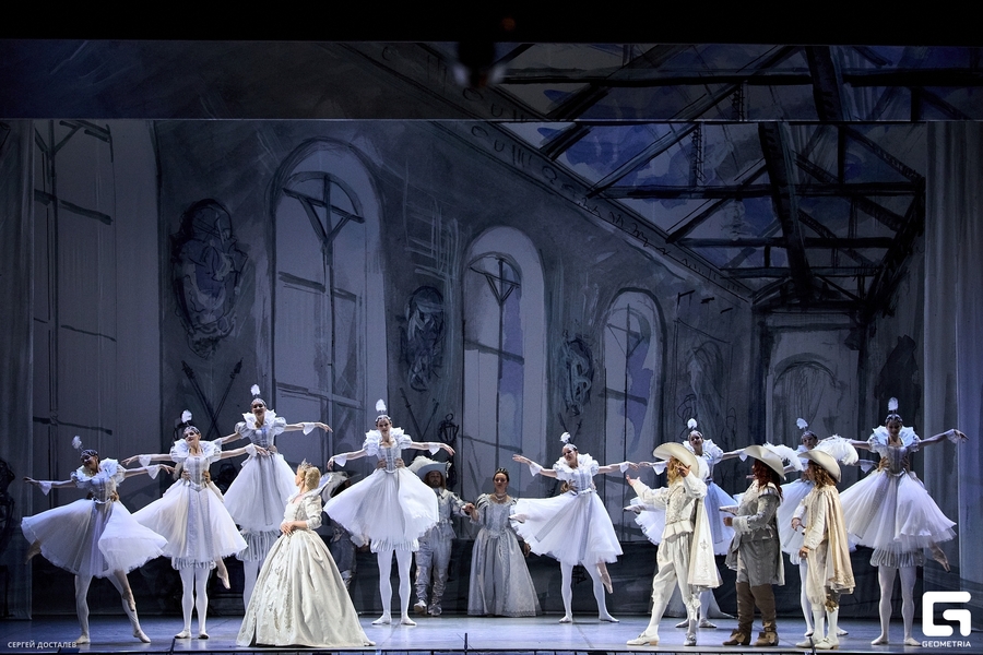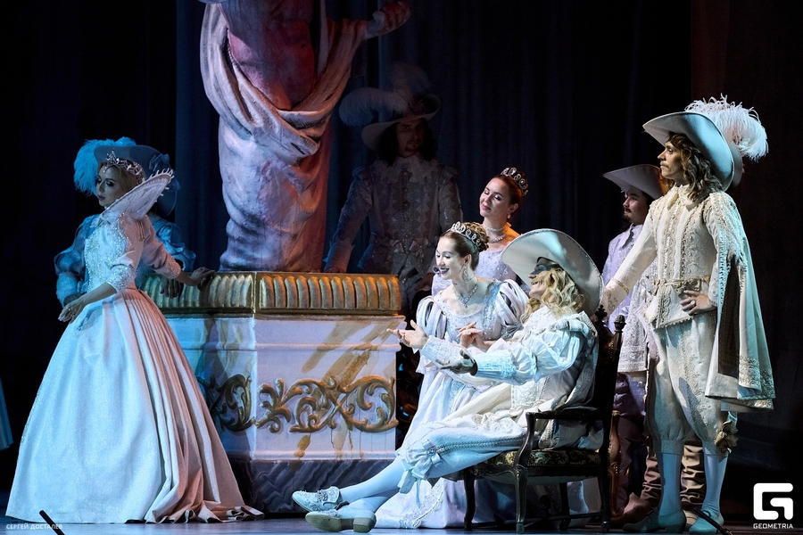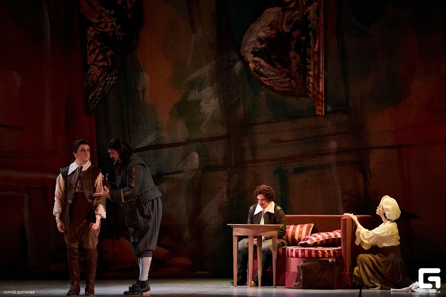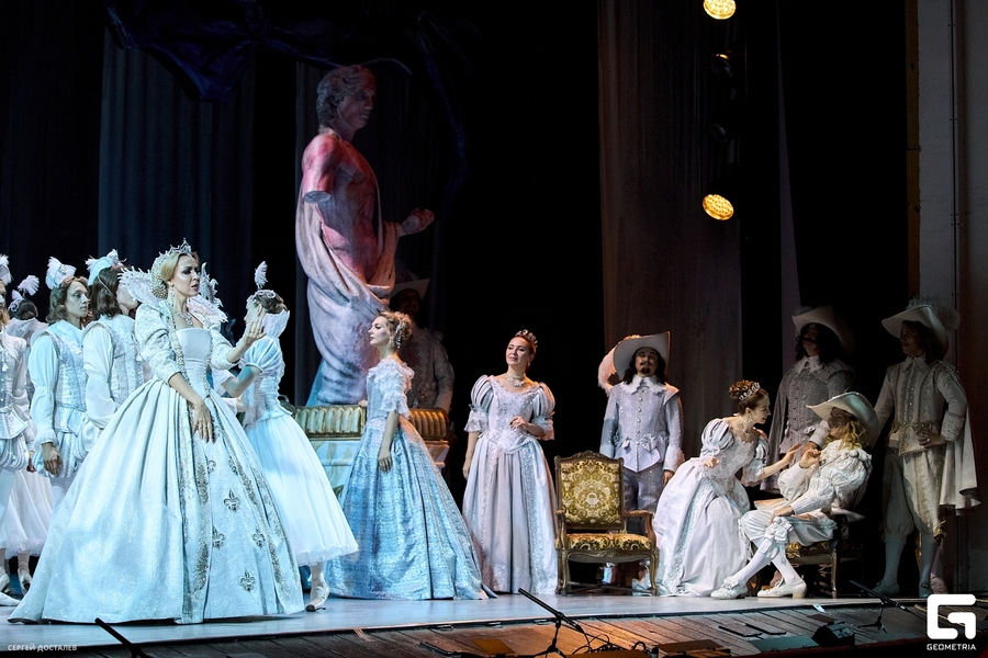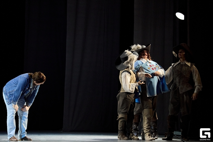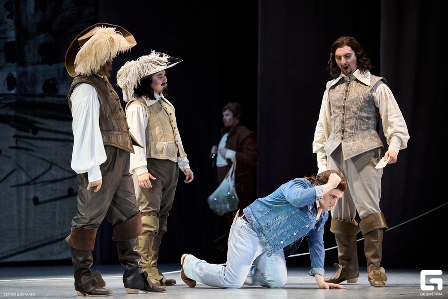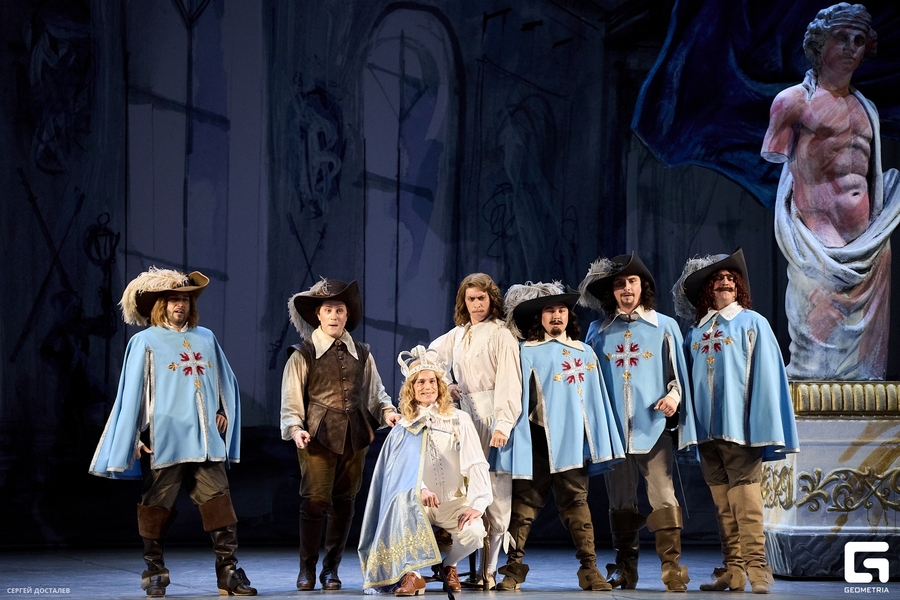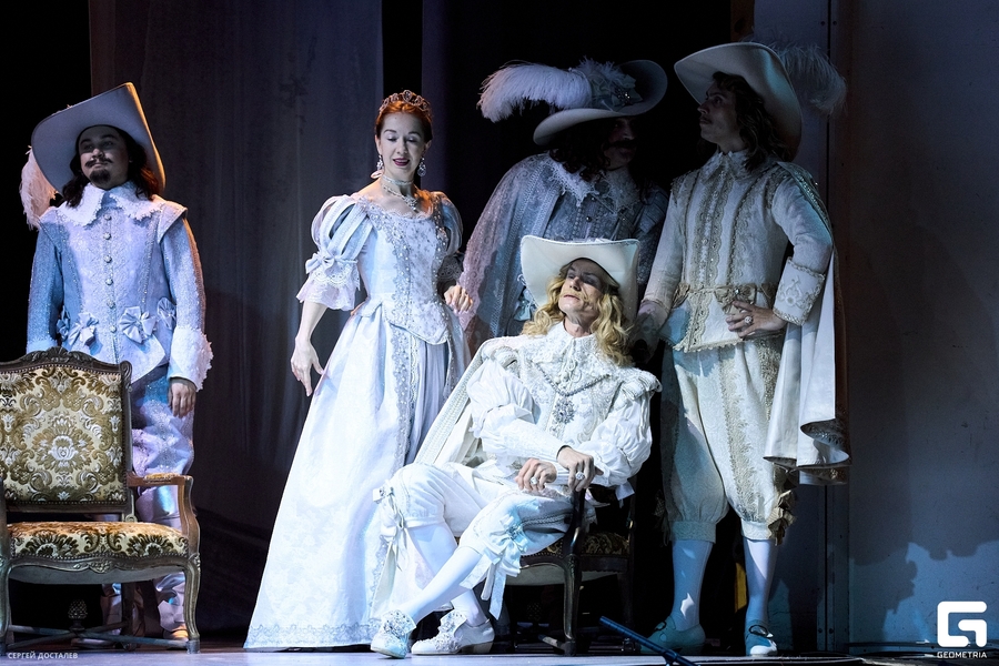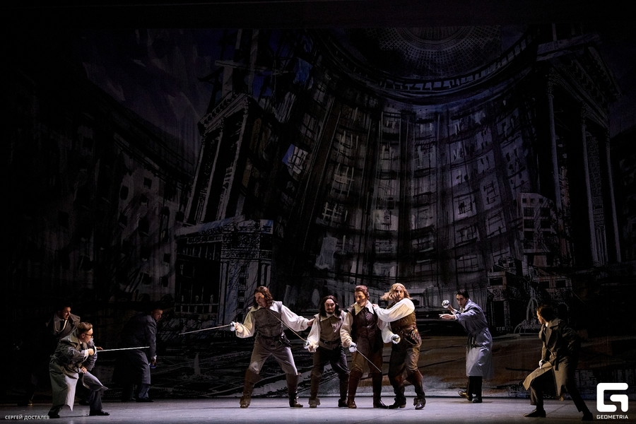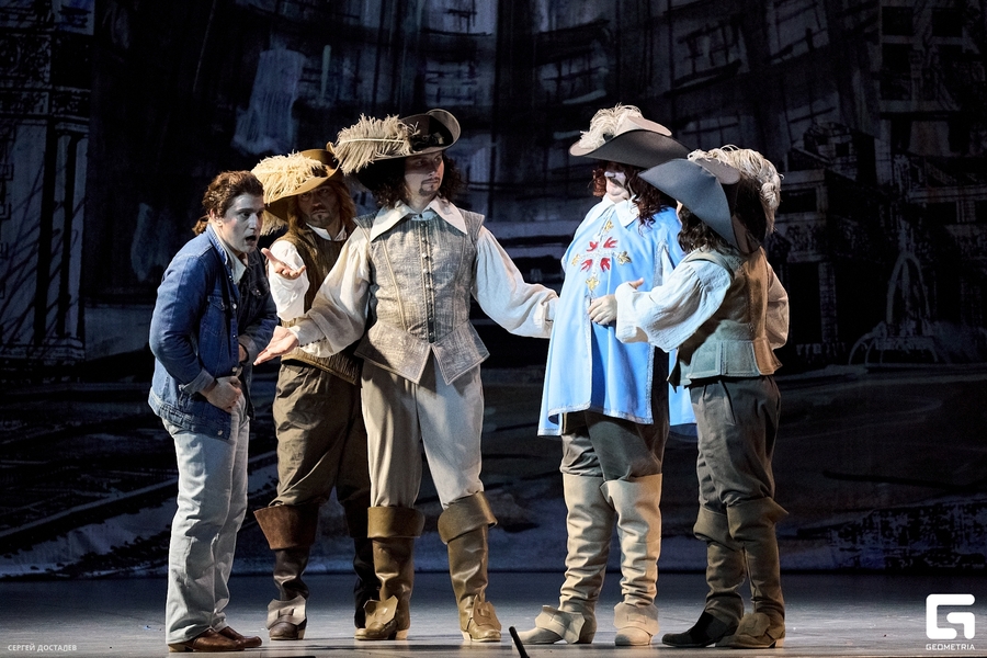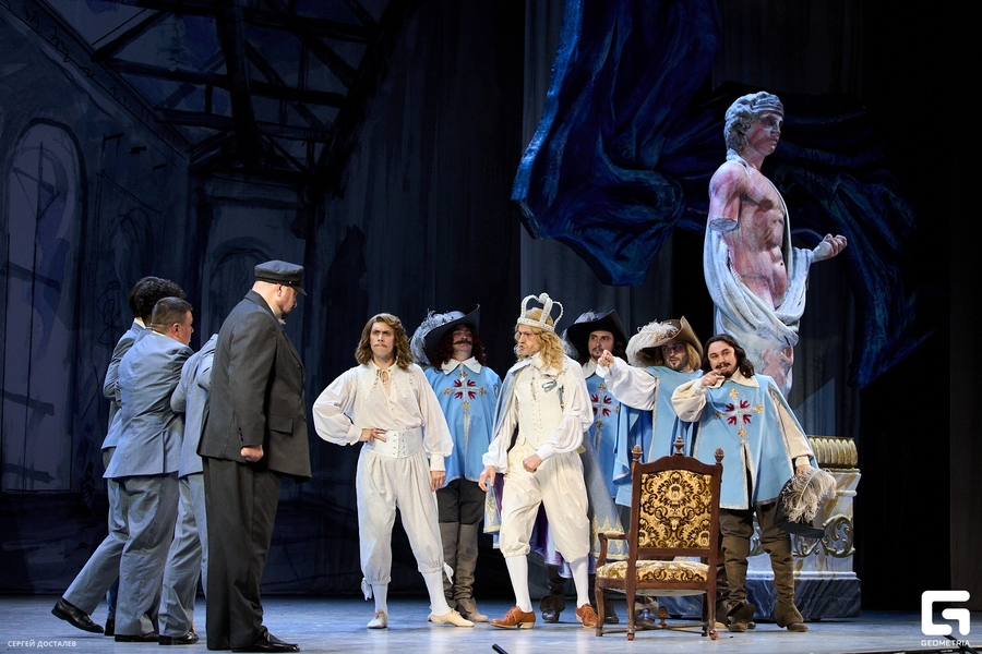 Сценография Валерия Кошлякова объединила сцену с оперой, соединив эпоху СССР начала 1970-х и Францию времен Людовика XIII.