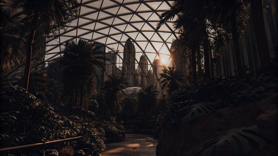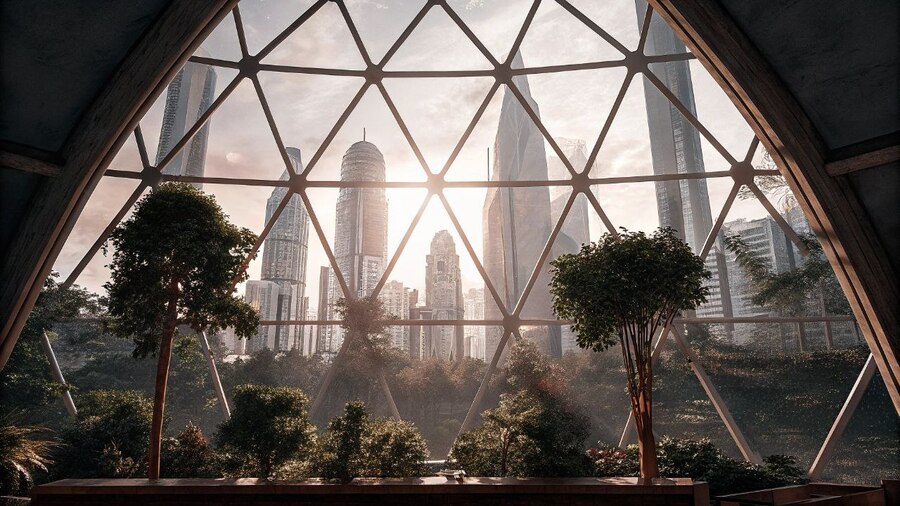 Long-distance shot. Inside the city. Lots of trees, plants, greenery. The buildings in the city are expensive hi-tech modern skyscrapers. The city is symmetrical and perfect, as if it were the future with new technologies. A giant glass dome has been erected over the city. Sun is bright.