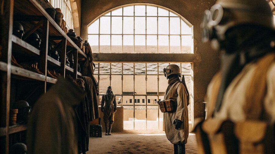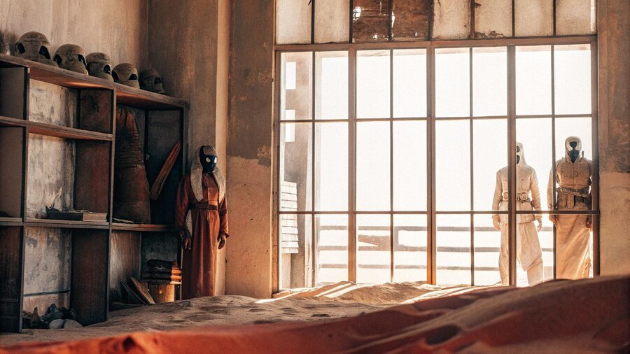Long-distance shot. The store looks like a desert, sand-colored walls, floor and ceiling. Mannequins are dressed in post-apocalyptic desert survival gear. There are many shelves. Glasses to protect against sand are placed on the shelves. Also on the shelves there are small figurines of old destroyed skyscrapers.