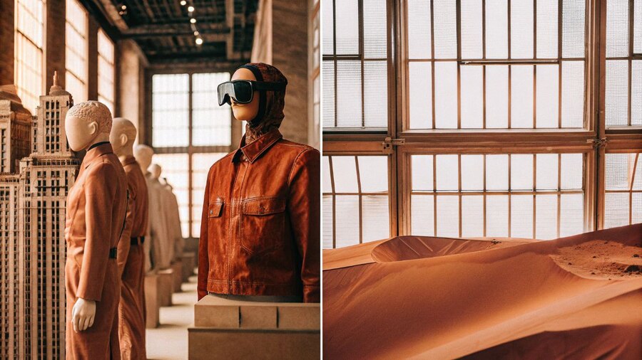 Post-apocalyptic survival gear and sand-protecting sunglasses are on a mannequin. There is a modern shop on the background.