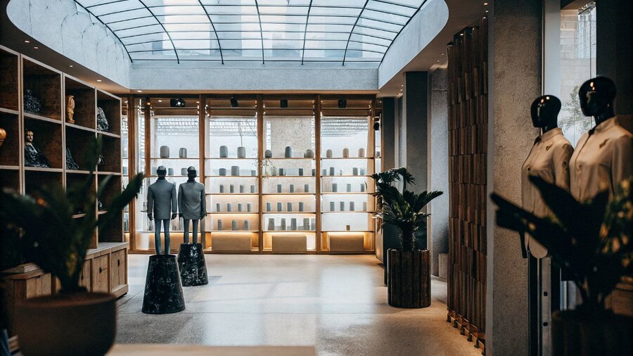 Long-distance shot. The store looks futuristic. The walls and ceiling are in light shades. There are many shelves. There are figurines of futuristic expensive skyscrapers on the shelves. There are many beautiful futuristic plants with unexpected forms on the shelves. Mannequins are dressed in futuristic expensive suits.
