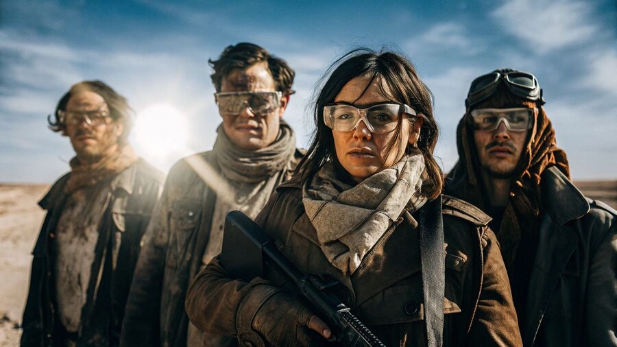 A group of people with different ages and hights. Dressed in post-apocalyptic desert survival clothing. Wear sand-protecting glasses. Have guns. There is a desert on the background. Sun is bright. There are no plants or water.