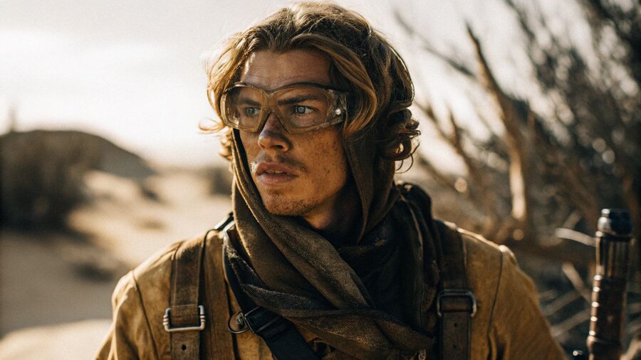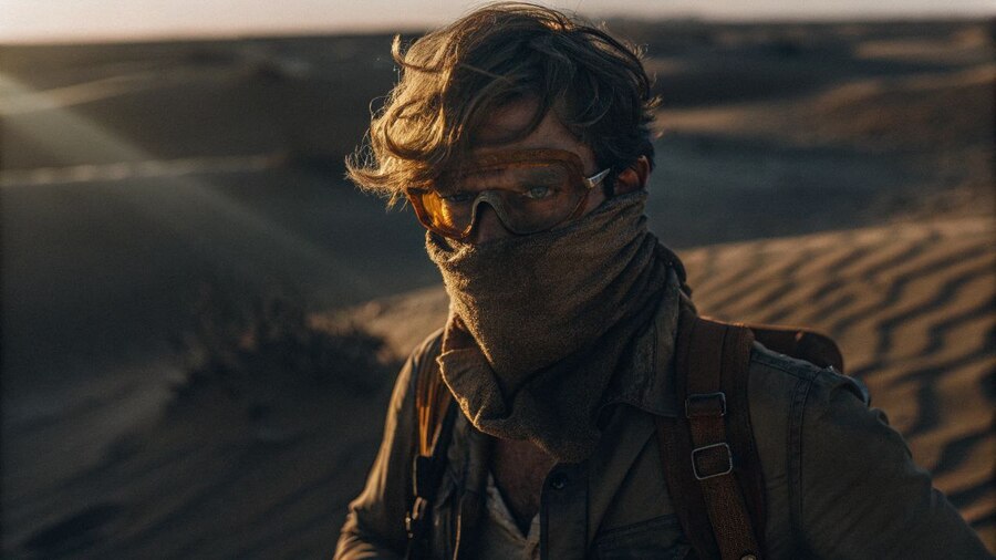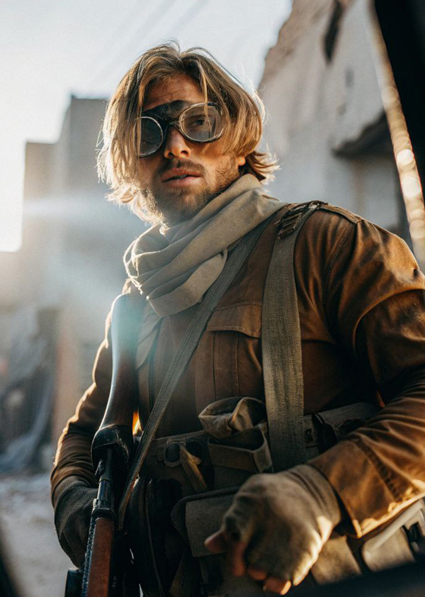 A 25-year-old guy with medium-length light curly hair with blue eyes. Dressed in post-apocalyptic desert survival clothing. Wears sand-protecting glasses. There is a desert on the background. Sun is bright.