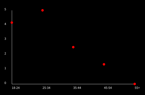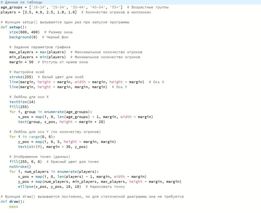 Статистика людей разных возрастных категорий, играющих в хоррор-игры. Точечная диаграмма и код в Processing.