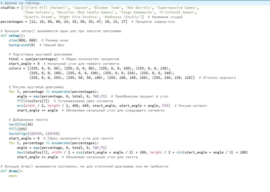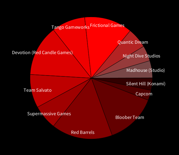 Статистика количества хоррор-игр, созданных известными игровыми студиями. Круговая диаграмма и код в Processing.