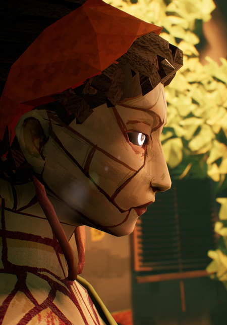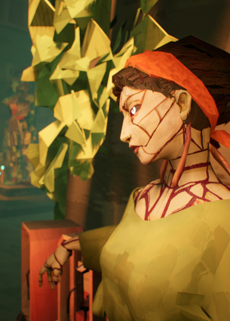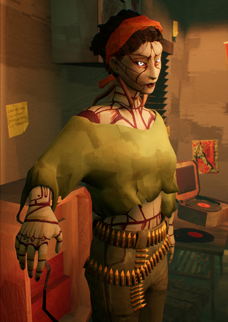 Персонаж и локация для видеоигры в сеттинге пост-киберпанка. Вокруг — жара, пыль, медленно угасающая жизнь.