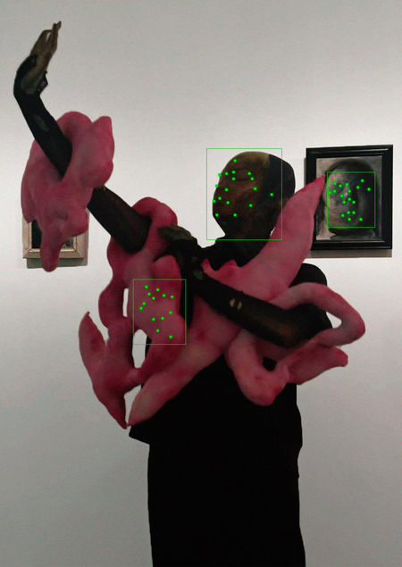 На экране спрятаны полиморфные объекты-детали, из которых зрители собирают свои инсталляции. Они управляются через веб-камеру, которая считывает движения игроков.