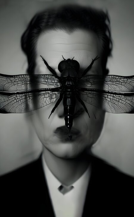 в изображении лиц или их подобие на плоских холстах или поверхностях, и стрекозу как образ моего манифеста, связанного с этим художником.