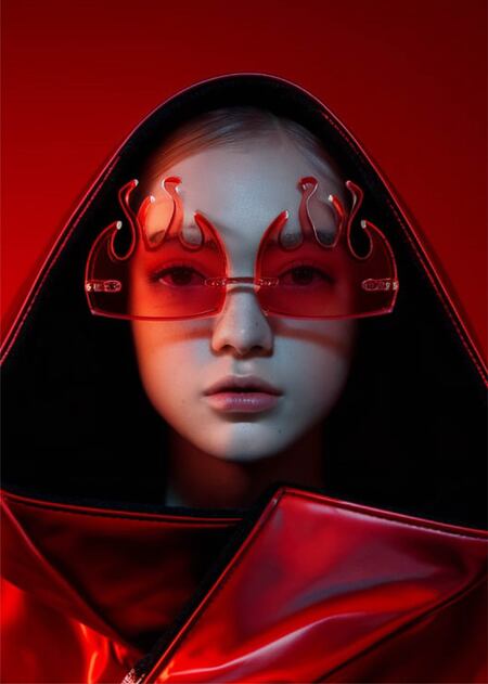 ideogram.ai промт: fashion photograph of a girl’s face in minimalistic futuristic red glass glasses with fire-shaped lenses on a completely white background. The overall atmosphere of the photo is edgy and luxurious. (Style: Auto)