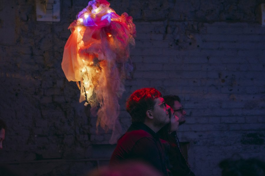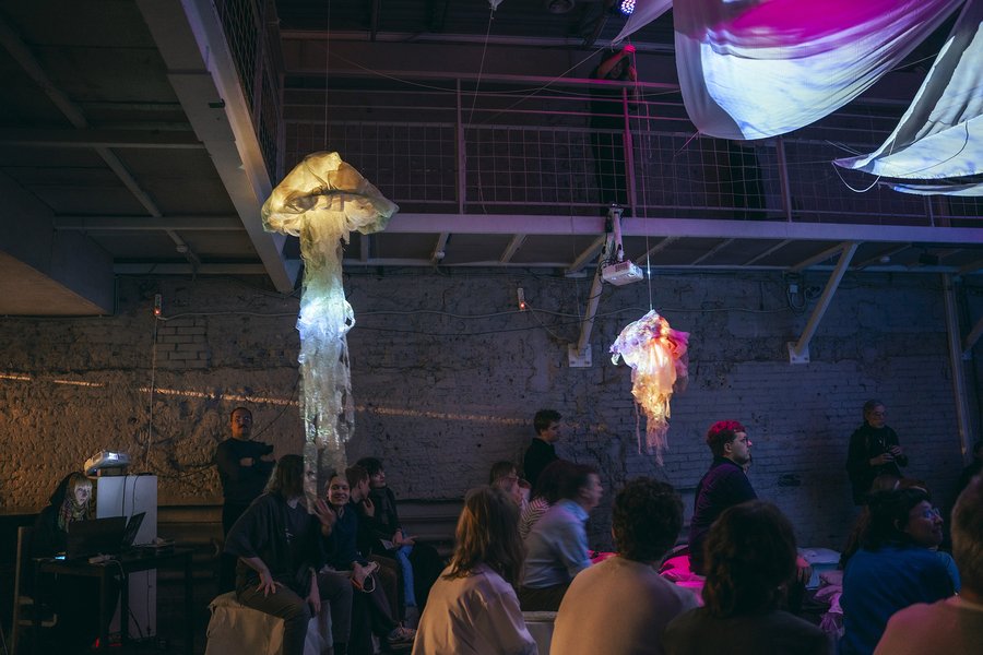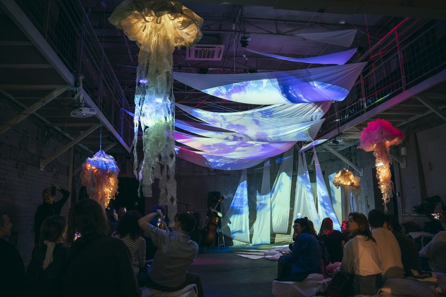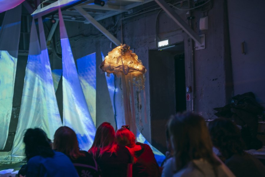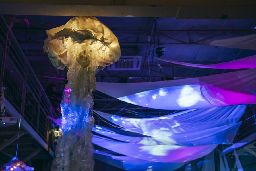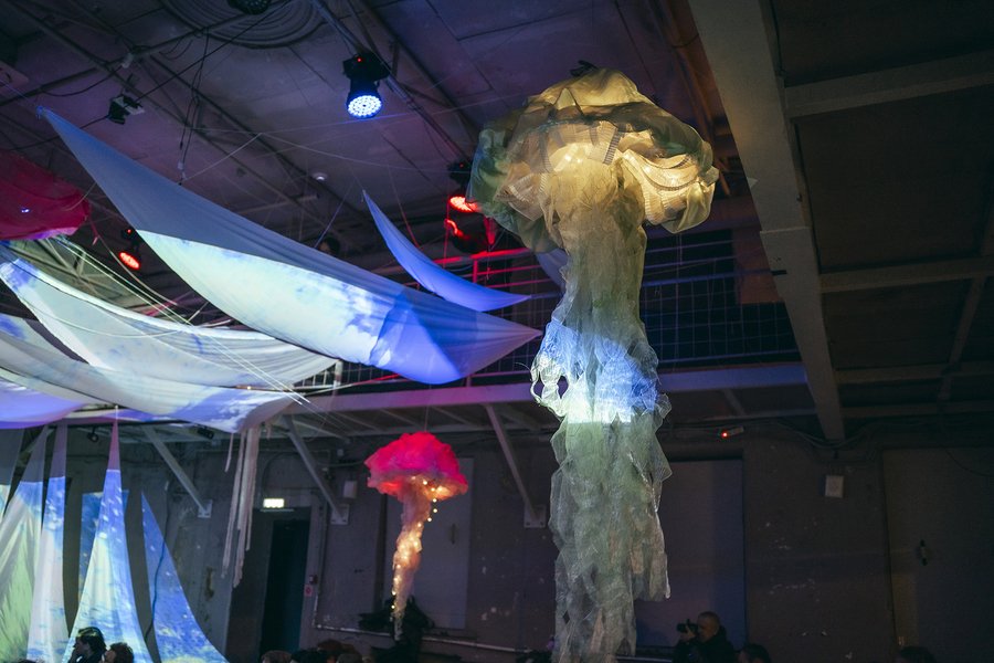 Попадание в морской простор сопровождает появление и танец светящихся медуз. Образ сочетает в себе как черты старомодных подвесных ламп с абажурами, навевающих уют, так и абстрактный текстильный дизайн. В основе конструкций — проволочный каркас, текстиль, свет. Атмосфера сгущается, цвета насыщенные.