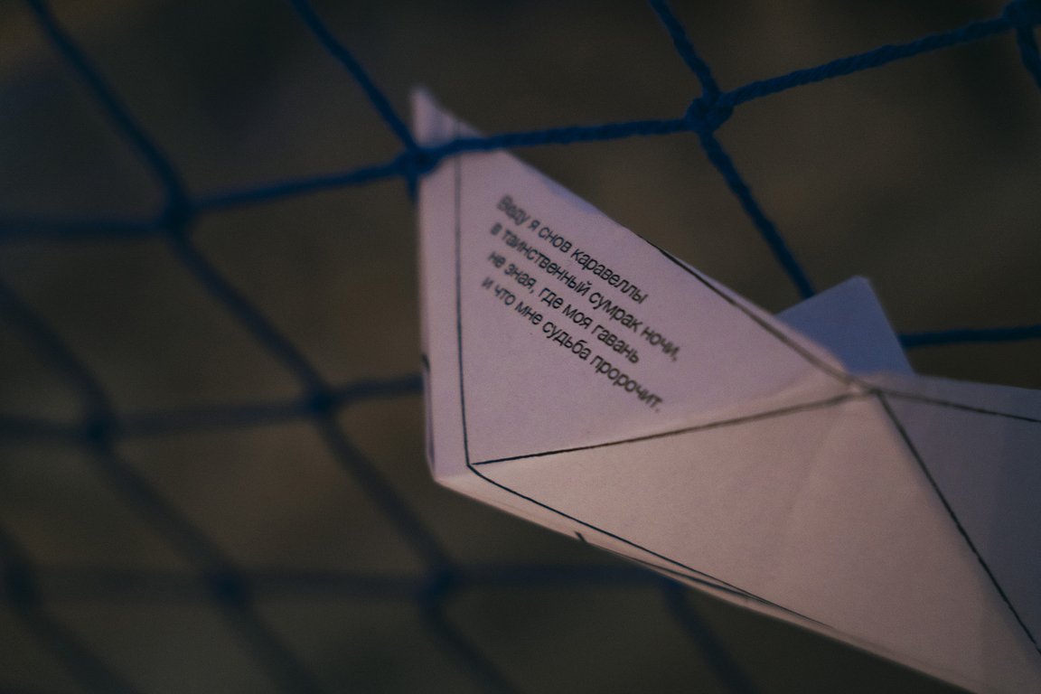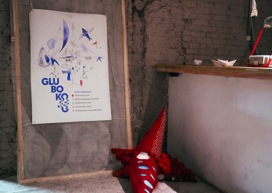 Входную зону сопровождает вступительный звук — зацикленный зов ракушки пуститься в путь, записанный на кассету старого магнитофона. У входа находится образная карта маршрута, а на синих сетях повисли кораблики со стихами.