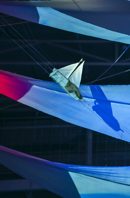Действие, открывающее и сопровождающее первый акт — появление и отправление в плавание ввысь маленького кораблика. В основе конструкции — натянутая леска и катушки. Атмосфера светлая, легкая.
