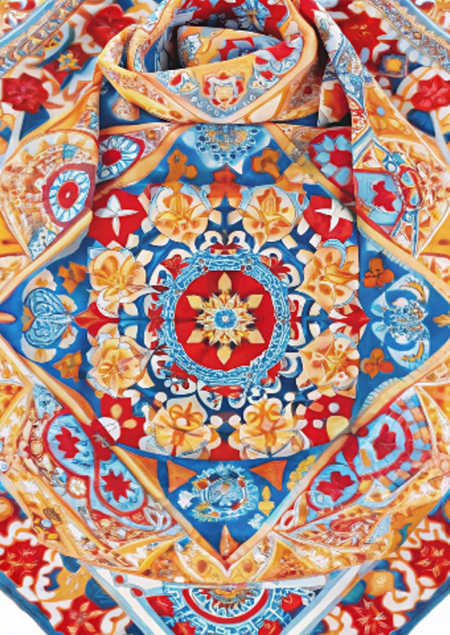 a geometrical printed square scarf in style of spanish azulejo tiles