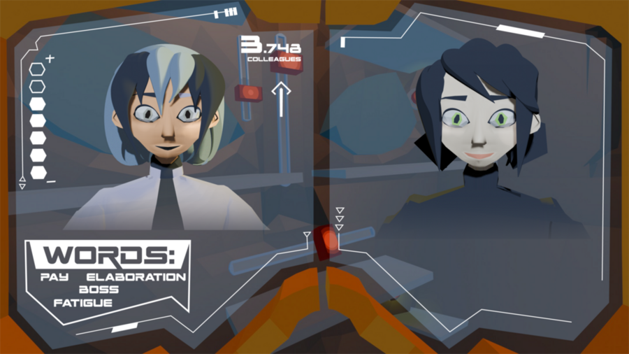 «exhibition dedicated to the game with this description: a 3D first-person action platformer where you play as a cockroach living inside a robot companion. guide her through the human world and help her overcome communication challenges to find her place in society. futurisic aesthetic, game displays»