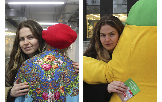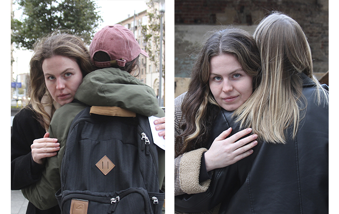 В серии фото я продолжаю тему некомфортной коммуникации, но решаю проблему в другом ключе. Фото представляют собой документацию способа коммуникации в виде перфомативного действия, где я, обнимая незнакомых людей, намеренно нарушаю их и свои личные границы, в попытках перебороть свой страх перед взаимодействием, разобраться в его причинах и почувствовать контакт с незнакомым человеком иначе.