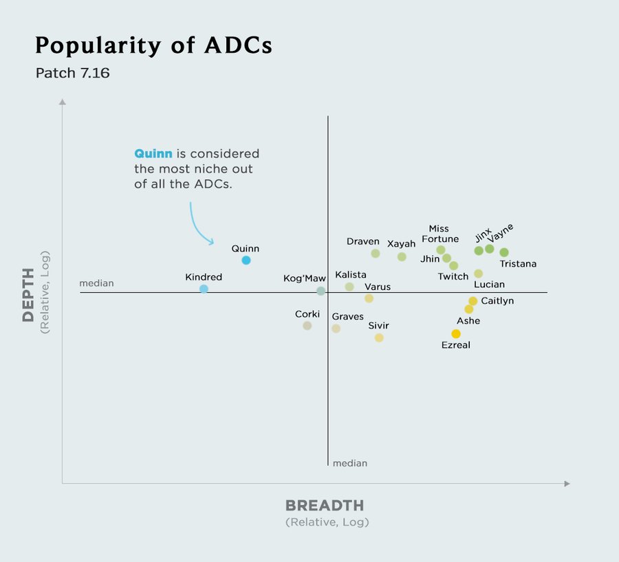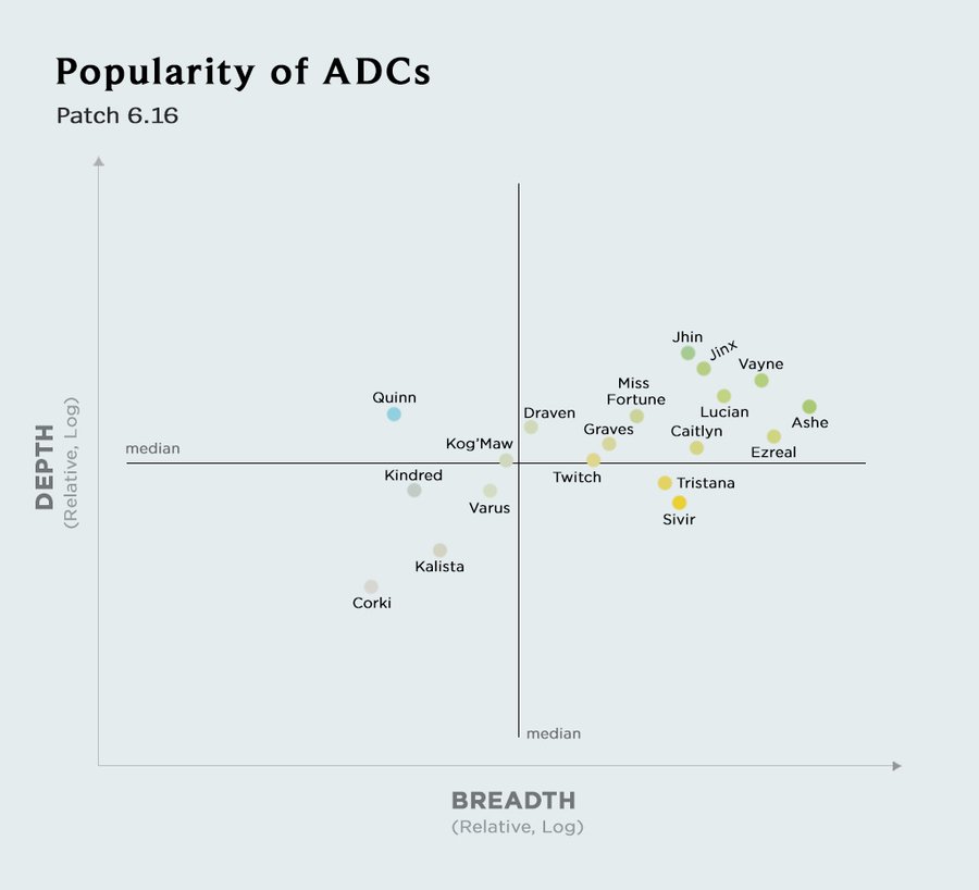 При этом нельзя забывать о уже существующих чемпионах, ведь игнорирование меты приведет к низкому пикрейту (частота появления персонажа в матчах). Пример: Скарнер до баффов в патче 13.14 и до его визуального и механического реворка.