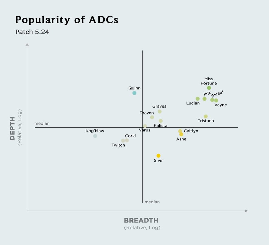 Популярность персонажей ADK (Attack Damage Kerry) в разных патчах League of Legends Noxus