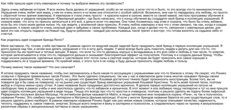 Я решила провести интервью с создательницей бренда и воспользовалась помощью Perplexity. Нейросеть сгенерировала несколько вопросов, которые раскрывают концепцию бренда и затрагивают новую коллекцию украшений: - Как тебе пришла идея стать ювелиром и почему ты выбрала именно эту профессию? - Как родилась идея создания бренда Ronix? - Почему именно такое название? Что оно означает? - Что для тебя значит твой бренд? - Что тебя вдохновляет на создание украшений? - Ты создала коллекцию колец, посвященную любви. В чем заключается концепция и почему ты затронула именно эту тему? - Как ты видишь свой бренд через 2 года?