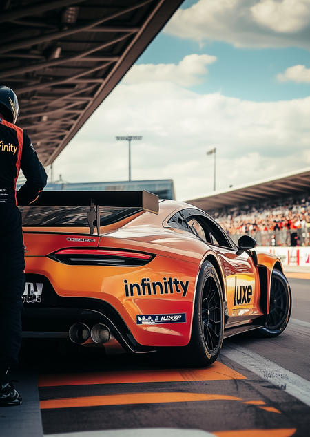 PROMT: photo in the distance of a racing car poster with the inscription «infinity luxe», colors black, orange and white