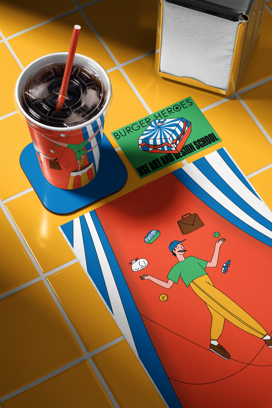 Objective: Show that creating a burger is not just food, but a real show full of creativity, experiments, and team work. Through collaboration, we combine the performativity of food and the performativity of design. ♪ creative idea: We show that behind the burger is a team of heroes, all of whom are masters. They come to the School of Design (the digital tent) with a new number: the blue burger is weird, bold, brave, like the best designer ideas. You can only see the result. But there’s a whole process behind it.