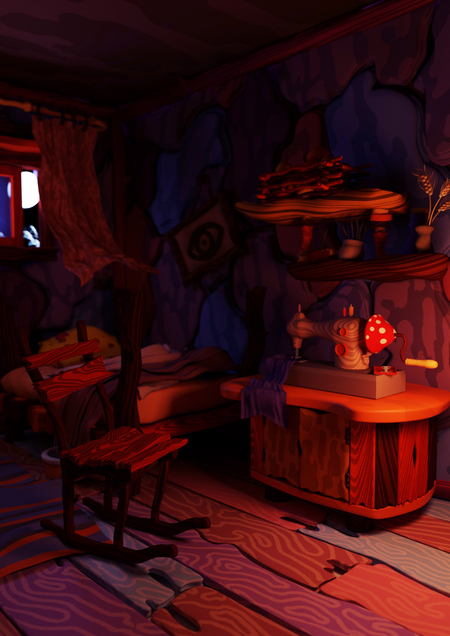 Небольшая комната вмещает все хобби своего жильца — и шитье, и варку зелий, — но всё еще остаётся местом его отдыха.