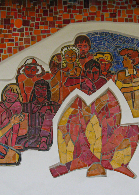 Исследуйте живописные залы и декорированные коридоры Дворца Пионеров — фрагменты смальты рассыпаны среди витражей, прячутся в углах лестничных клеток и даже вписаны в композиции для натюрморта в кабинете ИЗО.