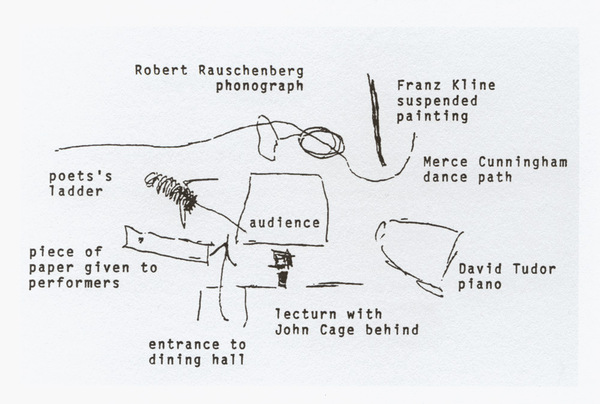 «Дэвид Тюдор играл на фортепиано, М. К. Ричардс и Чарльз Олсон читали стихи, на потолке висели белые картины Роберта Раушенберга, сам Раушенберг играл на пластинках, а Кейдж говорил. Я танцевал… Зрители сидели в центре площадки, лицом друг к другу, стулья были расставлены по диагонали, и зрители не могли видеть непосредственно все, что происходило. Была собака, которая бегала за мной по всему пространству, пока я танцевал. Ничто не должно было быть иным, чем оно было, — сложность событий, к которым зрители могли относиться по своему усмотрению,» — вспоминает Мерс Каннингем.