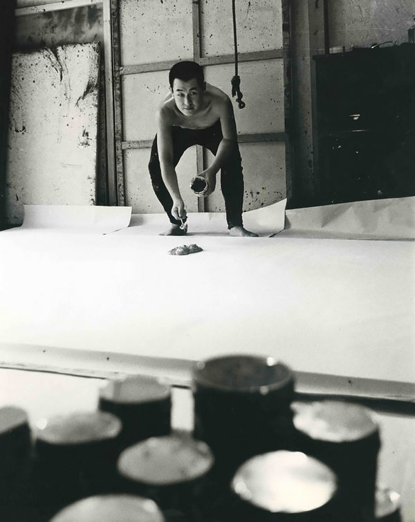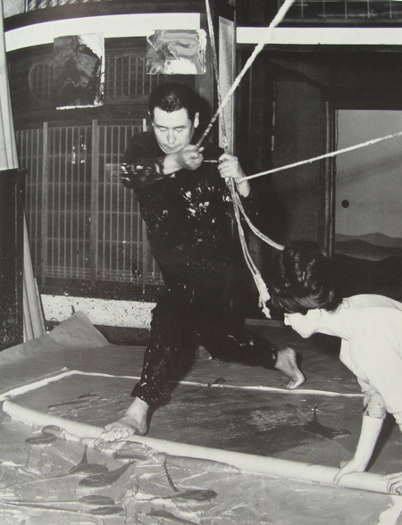 Кацуо Ширага (в некоторых источниках Кацуо Сирага), который тоже был членом Ассоциации Гутаи, стремился перенести сущность человеческой энергии в материю и почувствовать единство с пустым холстом. Радикально отказавшись от кисти, Ширага исключил из своей работы заранее продуманную композицию. Художник придумал свою технику создания живописи действия. Он держался руками за веревку и использовал свое тело в качестве инструмента, нанося краску ногами на холст. Как и в случае с Поллоком, процесс создания (скольжения ногами по полотну) и процессуальность становятся частью произведения Кацуо Шираги.