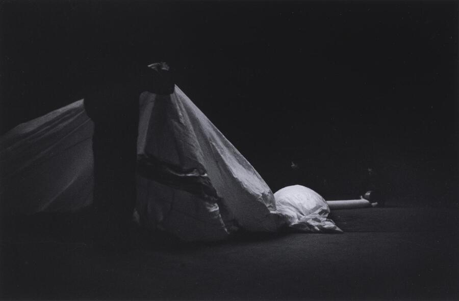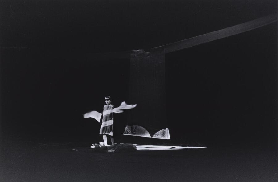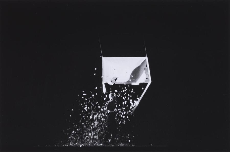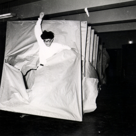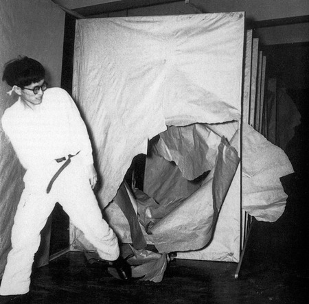 Начать этот раздел я хотела бы с перформанса Сабуро Мураками «Пассаж» («Passing through»). Художник установил в ряд несколько холстов с натянутой на них бумагой и прыгнул в них. Прорывание через бумагу можно рассматривать как некий радикальный разрыв с плоскостью и статичностью и выход в процессуальность и перформативность. Первый раз перформанс был показан в 1956 году (через год после создания «перформативной картины» Кацуо Сирага), и затем Сабуро Мураками повторял его несколько раз (например, в 1994 году (документация представлена в видео ниже)), меняя количество бумажных экранов.