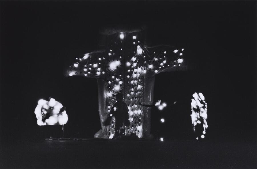 Кацуо Ширага в костюме собственного изготовления танцует Санбасо на сцене, 1957