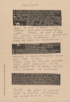 Нормы, по которым определялась вышеупомянутая ценность искусства, критикуются участниками Флюксуса, которые не соглашались с полномочиями музеев определять ее (ценность искусства) и считали, что искусство предназначено не только для образованной элиты. В манифесте флюксуса, выпущенном в 1963 году, вырезки из словаря дополняются написанными от руки тезисами Мачьюнаса: «Поддерживать революционный прилив и наводнение в искусстве, развивать живое искусство, антиискусство, творить реальность без искусства, понятную всеми народами, а не только критиками, дилетантами и профессионалами».