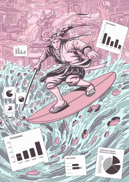 Промпт: a samurai from junji ito manga surfing through countless python data and histograms with pie charts. The picture is black and pink, with intricate details in the background.