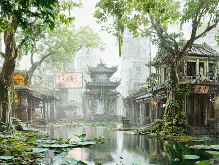 A breathtaking, decayed city where towering Soviet brutalist structures have been overtaken by lush vegetation. Chinese temple rooftops peek through dense tree canopies, their golden dragons now homes for birds. Vietnamese floating markets, once bustling with life, drift through mist-covered canals filled with lily pads and overgrown lotus flowers. Kazakh yurts, reinforced with futuristic metal plating, serve as makeshift homes for the last survivors. Flickering holographic billboards project long-dead advertisements, their neon glow reflecting in the murky water. A sense of eerie beauty pervades the ruins, as civilization and nature fuse into something new. Hyper-realistic, cinematic wide-angle shot, 16K resolution, volumetric lighting, deep atmospheric perspective --chaos 40 --ar 4:3 --stylize 750 --weird 100750 --weird 100