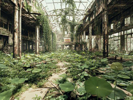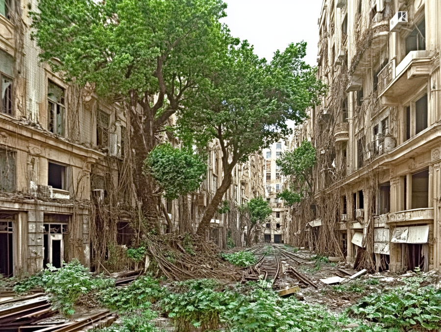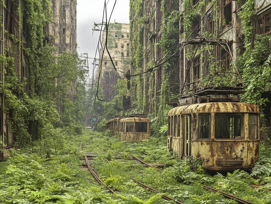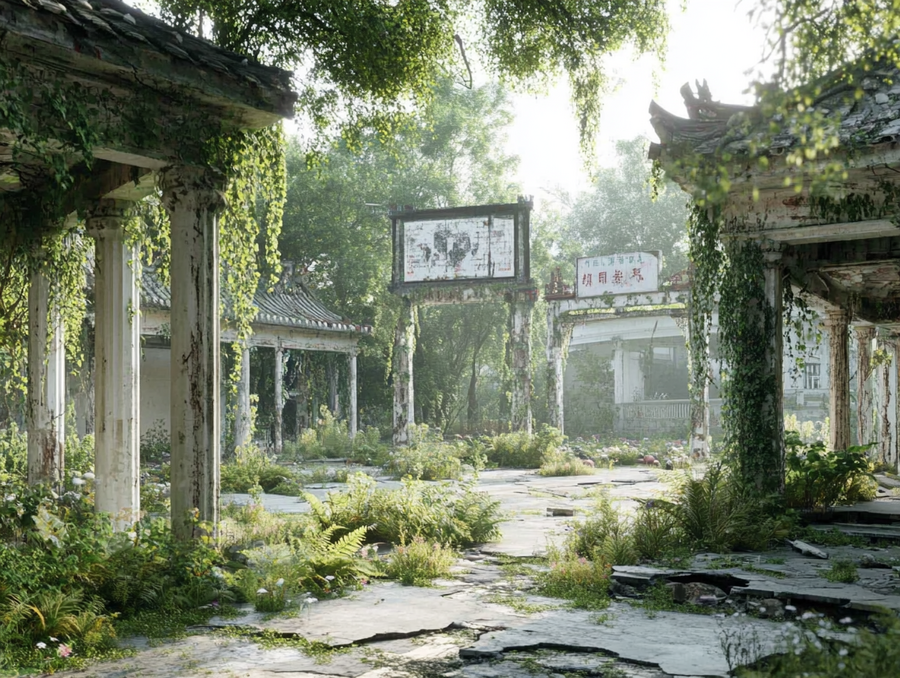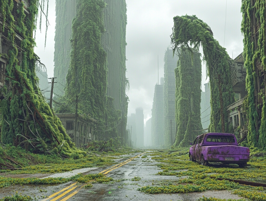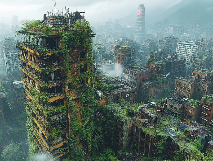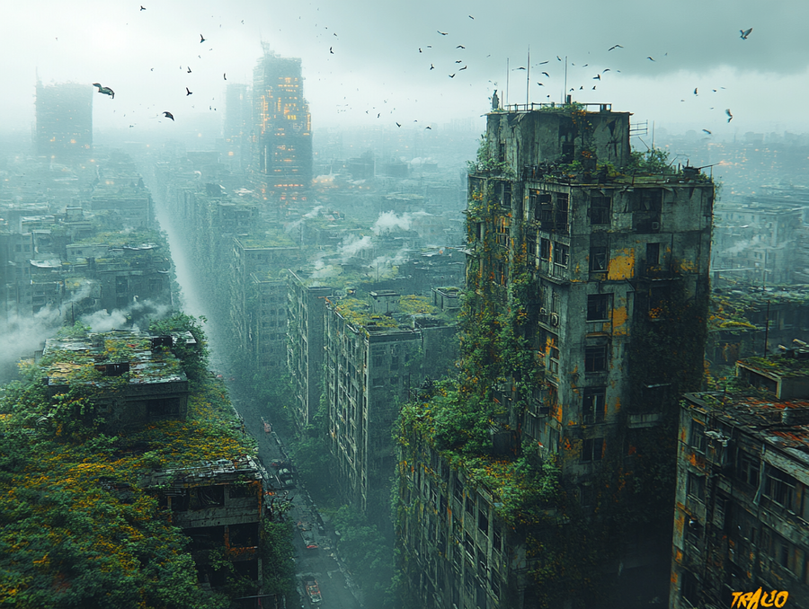 A sprawling, once-grand metropolis now consumed by nature, where Soviet brutalist towers crumble beneath thick vines, and Chinese imperial palaces stand half-submerged in a vast jungle. Vietnamese stilt houses lean precariously over flooded streets, while remnants of Kazakh yurts are hidden beneath moss-covered ruins. Rusted monorails dangle over empty highways, and bioluminescent fungi glow softly in the shadows. In the distance, flickering neon signs hint at a lost civilization, their messages long forgotten. The air is thick with mist, and the golden rays of the sun pierce through the broken rooftops, creating an ethereal, melancholic beauty. Hyper-detailed, ultra-HD, cinematic lighting, atmospheric fog, nature’s quiet takeover --chaos 40 --ar 4:3 --stylize