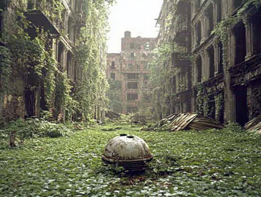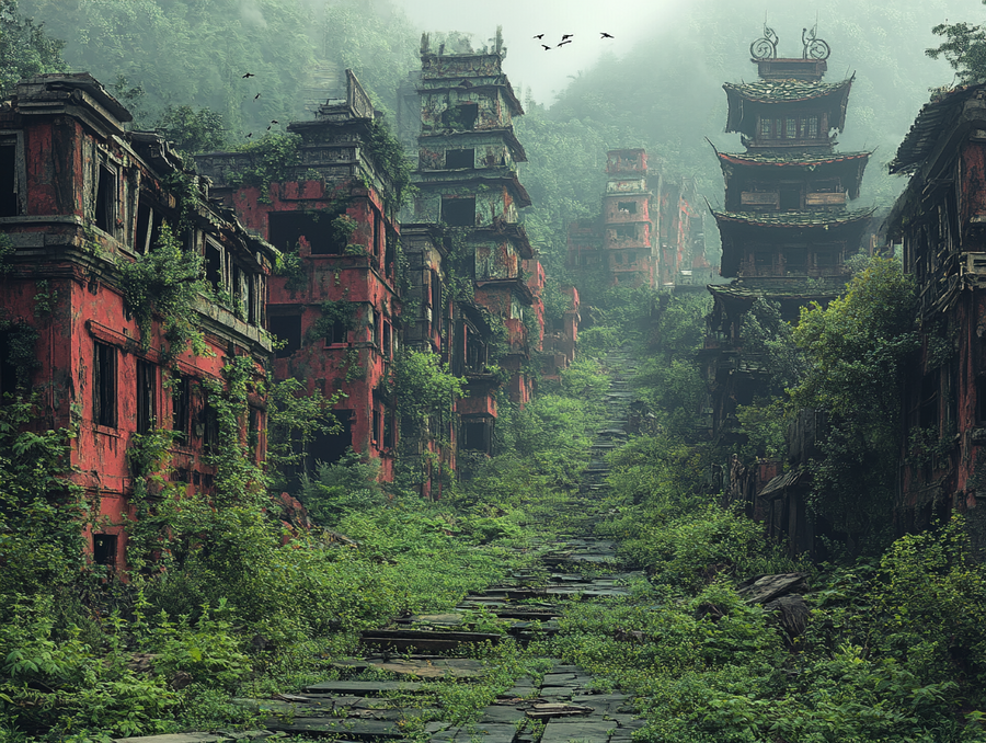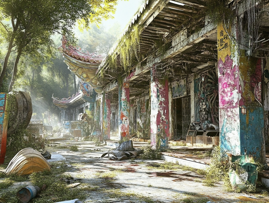 A once-thriving city now overgrown with nature, blending the remnants of Soviet brutalist architecture, Chinese imperial palaces, Vietnamese stilt houses, and Kazakh yurts reclaimed by time. Vines creep over abandoned factories, while futuristic holograms flicker in the distance. Towering pagodas, now worn and cracked, house birds and wildlife, while underground tunnels serve as hidden markets for scavengers and traders. The fusion of history, decay, and technology creates a haunting yet beautiful post-apocalyptic aesthetic. Hyper-detailed, cinematic realism, soft light filtering through ruins, breathtaking and eerie at the same time. --chaos 5 --ar 4:3 --stylize 750